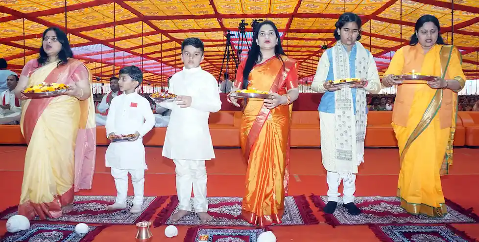 परम पूज्य गुरुवरश्री ने जैसे ही अपने चिन्तन को विराम् दिया, आरती का क्रम शक्तिस्वरूपा बहनों व सिद्धाश्रम चेतनाओं ने प्रारम्भ किया। आरतीक्रम सम्पन्न होने के पश्चात् शिविरस्थल पर उपस्थित सभी भक्तों, श्रद्धालुओं ने क्रमबद्ध होकर गुरुचरणपादुकाओं का स्पर्श करते हुए प्रसाद प्राप्त किया।